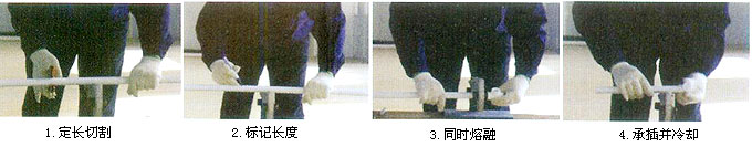 4、同时熔融PE管材、管件,然后承插(承插到位后待片刻松手,在加热、承插、冷却过程中禁止扭动)。